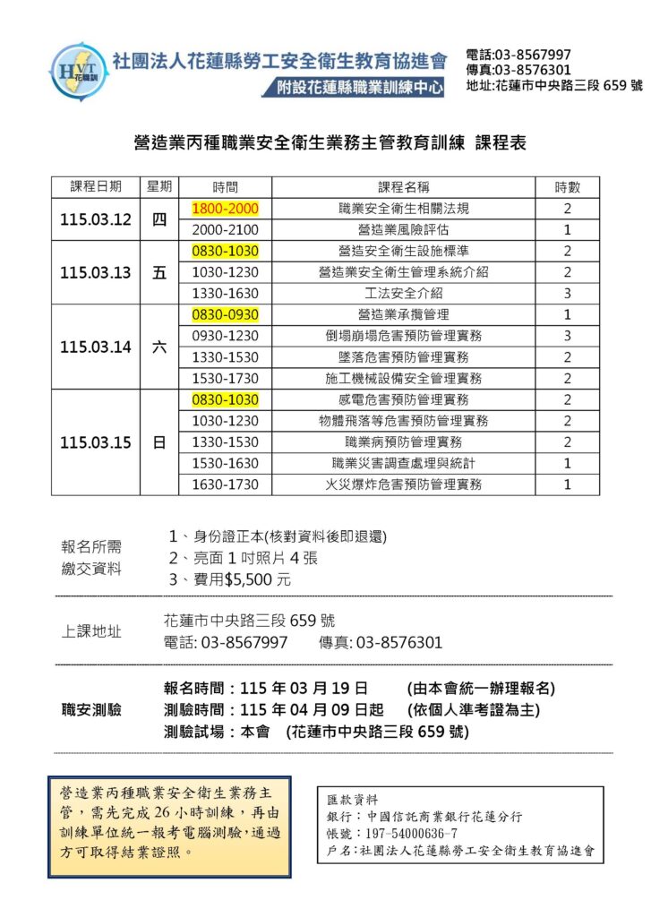 1150312-1150315營造業丙種職業安全衛生業務主管