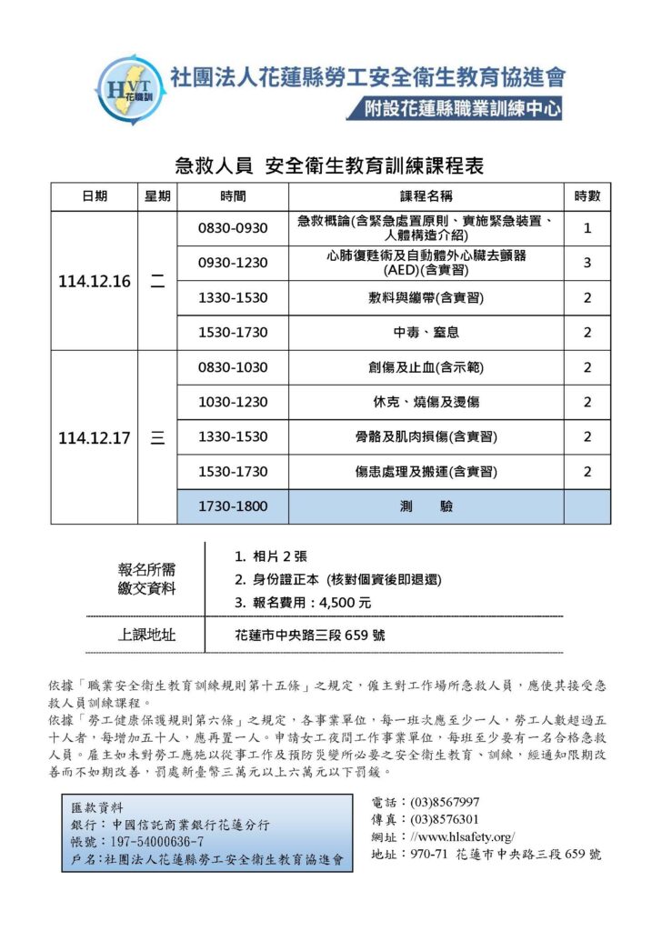 一、社團法人花蓮縣勞工安全衛生教育協進會(下稱本會)為提供課程報名相關服務,並確保報名台端之利益,將遵循個人資料保護法及相關法令之規定,蒐集、處理及利用報名學員所提供之個人資料,包括台端姓名、性別、出生年月日、身分證字號、學歷、行動電話、電子郵件帳號、戶籍地址、通訊住址、服務機構、職稱、受訓紀錄等。